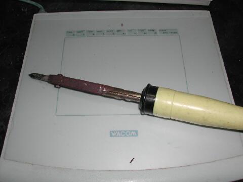 頭の刃、歯、目、手裏剣(?)を半田ごてで溶かして描き込む。一発勝負ですよ。